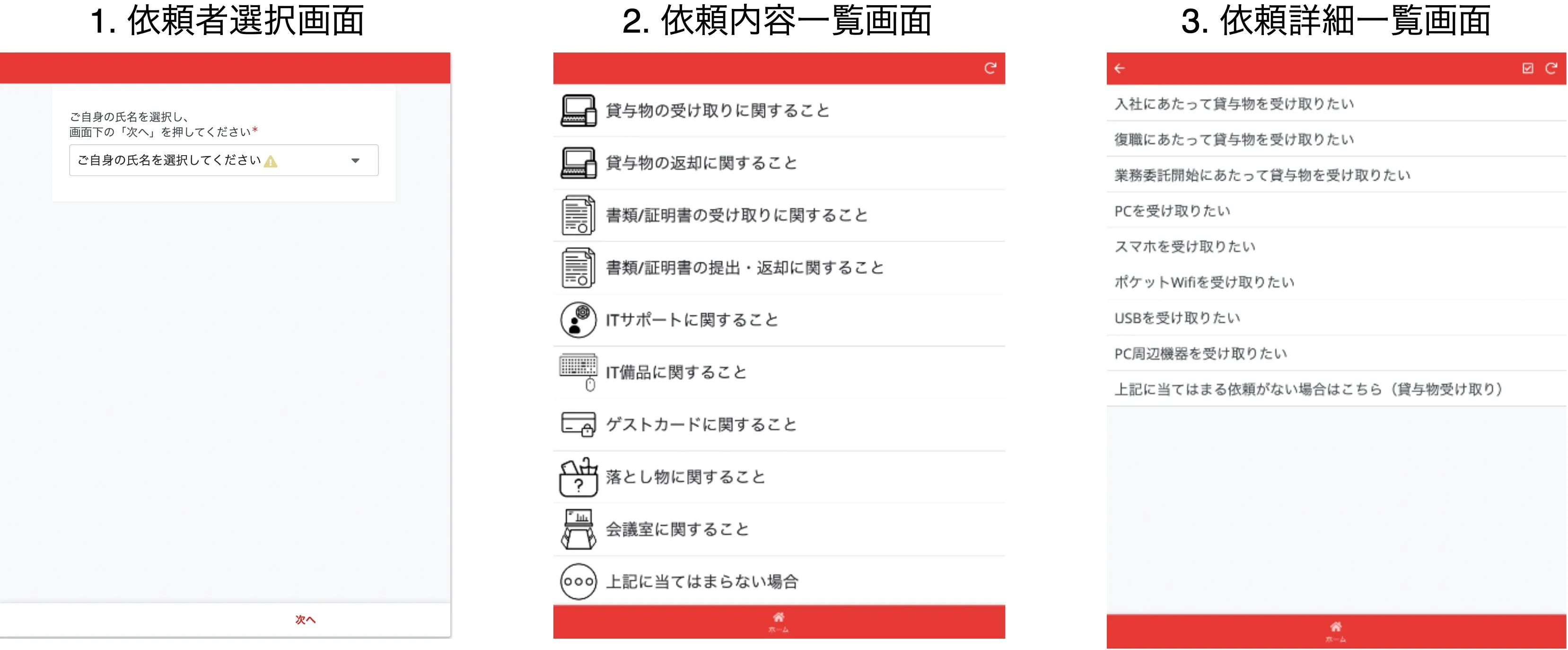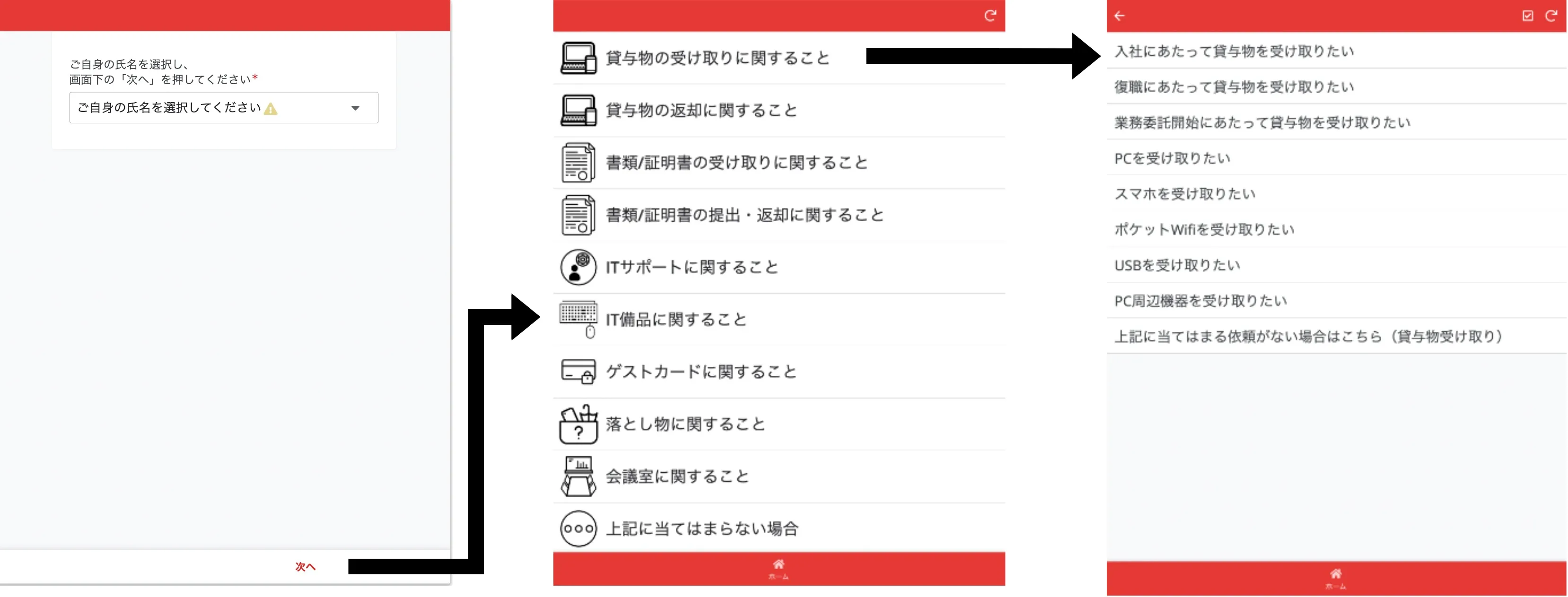 利用方法は、自身の名前を選択してもらい、コーポレート部門への依頼内容を選択するという形です。