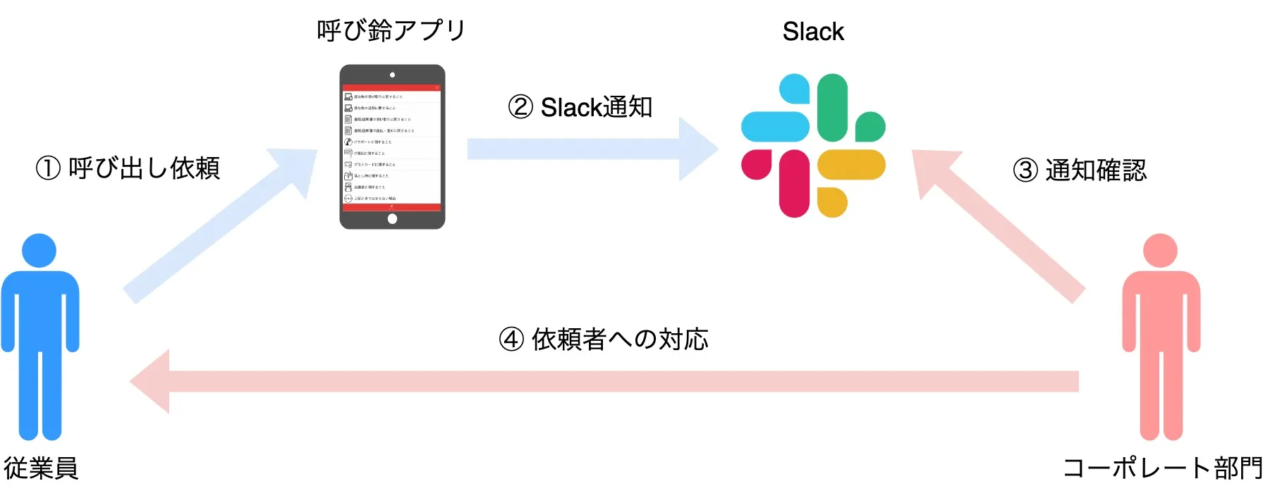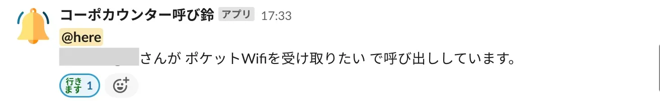 呼び出し依頼は専用の Slack チャンネルに通知が来るので、各コーポレート部門の担当者が通知内容を確認して、従業員が居るカウンターに行き、対応という流れになります。