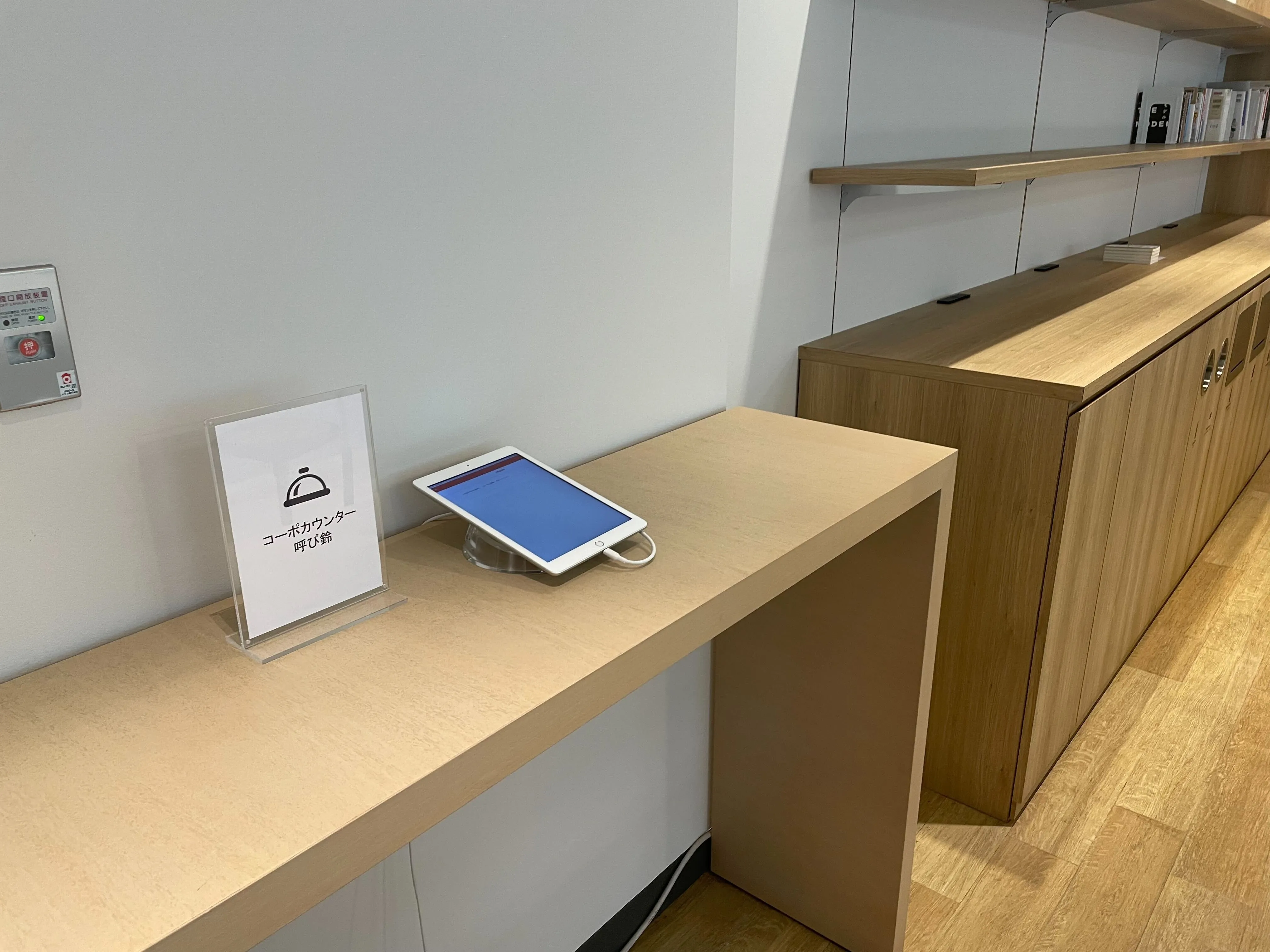 コーポレート部門の近くのカウンターの上に iPad が置いてあり、そこから呼び出してもらいます。