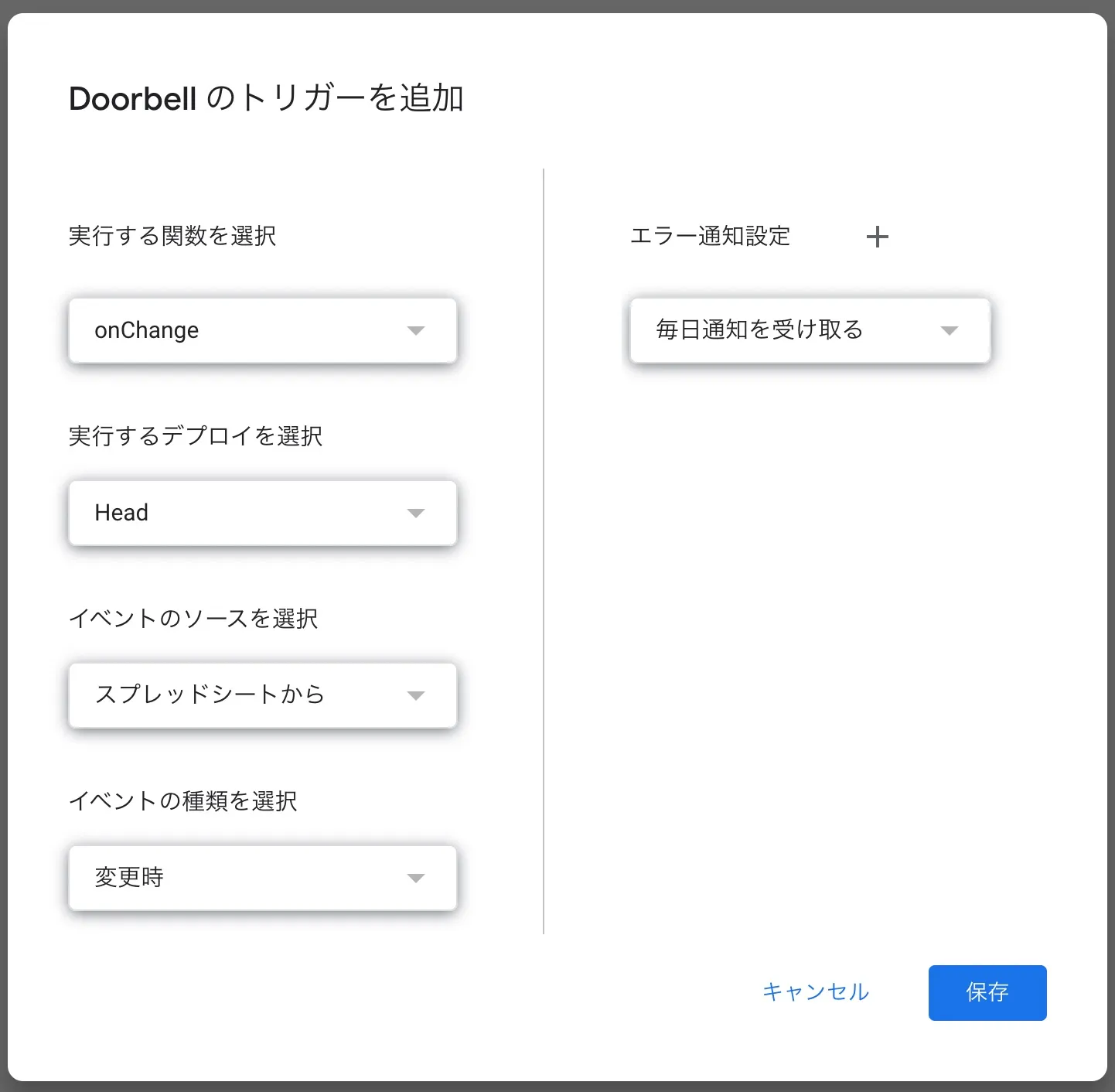 スプレッドシートに呼出履歴が登録(行追加)されたら、onChange() を実行するように設定します。