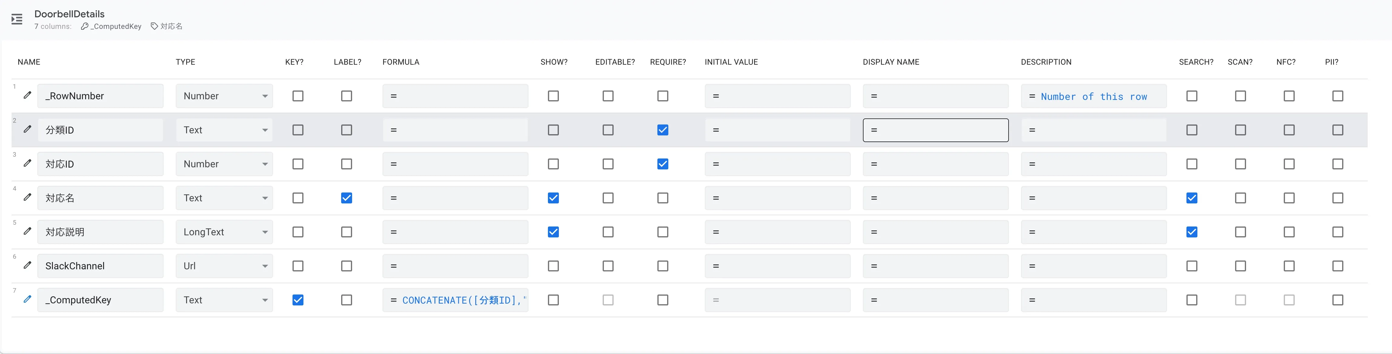 分類 ID 列は Doorbell でも同名の列を作成し、そこで設定した値と合わせてください。また、対応 ID は分類 ID 内でユニークになるように設定してください。