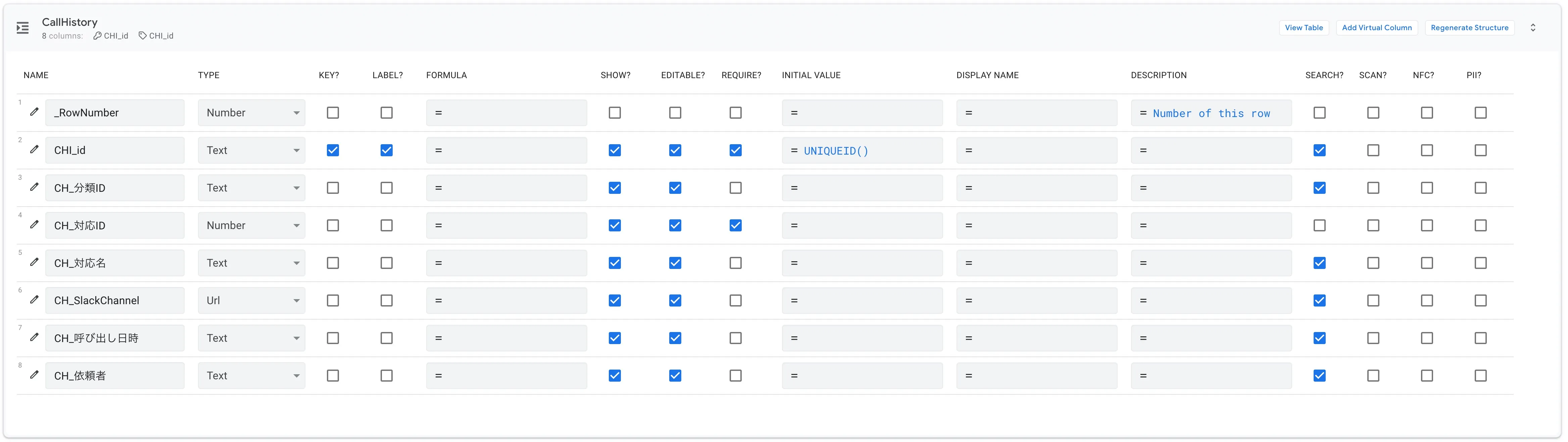 | 1 | CH_id | CH_分類 ID | CH_対応 ID | CH_対応名 | CH_SlackChannel | CH_呼び出し日時 | CH_依頼者 |