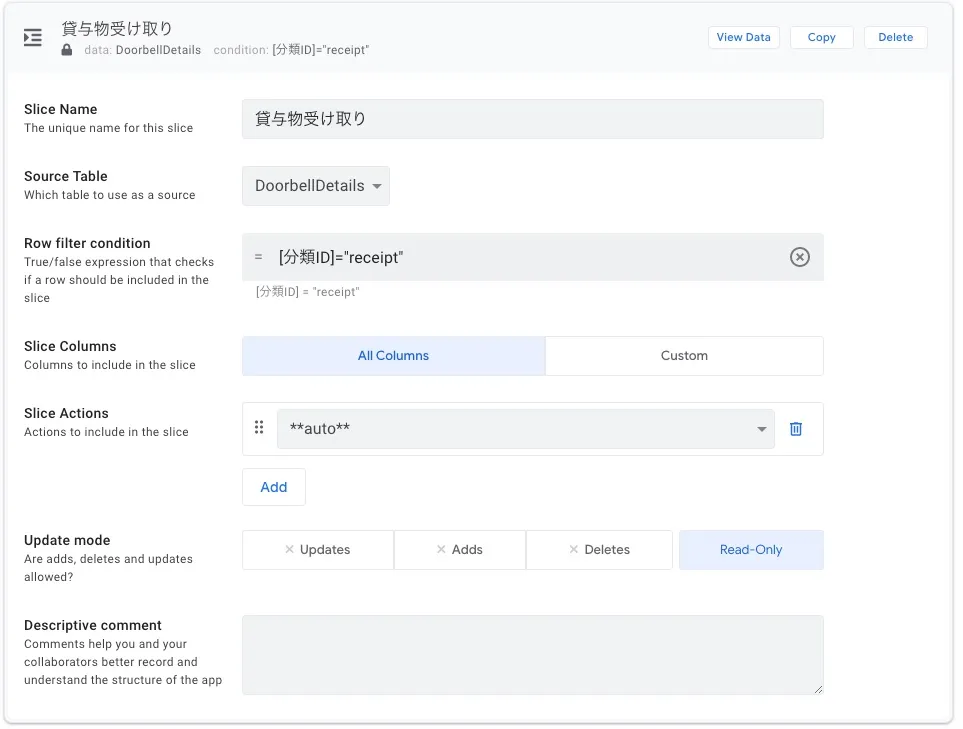 次に、Slice の設定を行います。Slice は依頼内容ごとに画面表示を切り替えるために「DoorbellDetails」のデータを元に作成します。