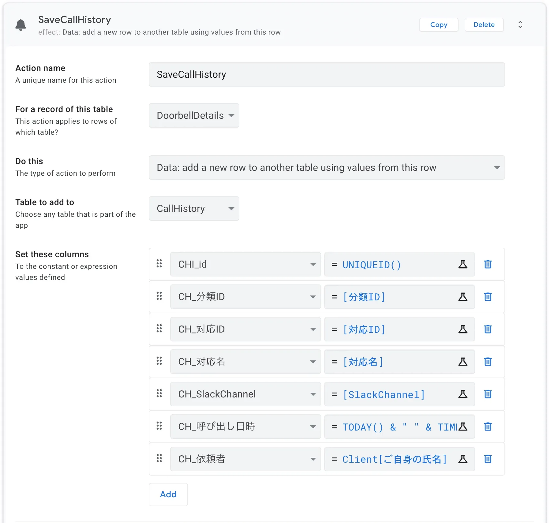 | Confirmation Message | CONCATENATE(“依頼者:“,Client[ご自身の氏名],"",“呼び出し内容:”,[対応名],"",“担当者を呼び出しますか?”) |