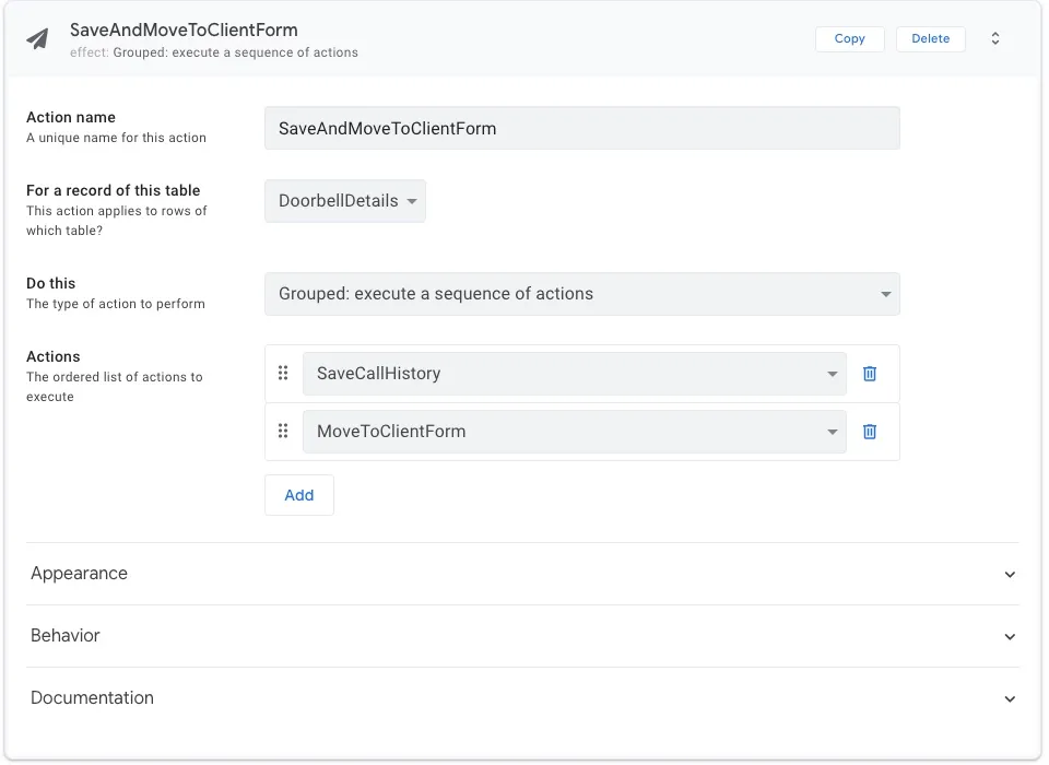 呼出履歴に保存後、依頼者選択画面に遷移する Action です。この Action を依頼詳細一覧画面の Event Actions に紐付けます。