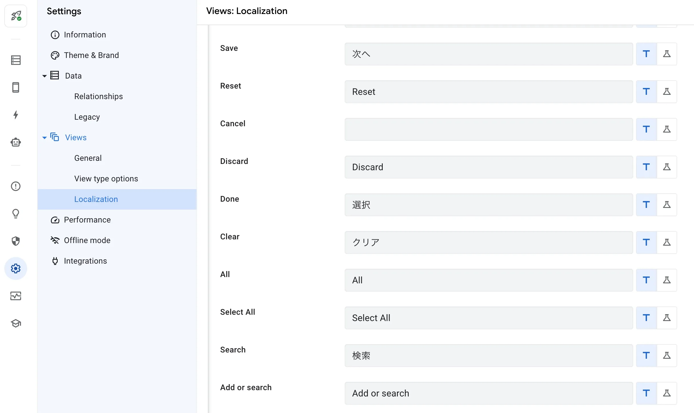 → テキストに関しては、Settings → Views → Localization で「Save」を「次へ」に変更して対応しました。