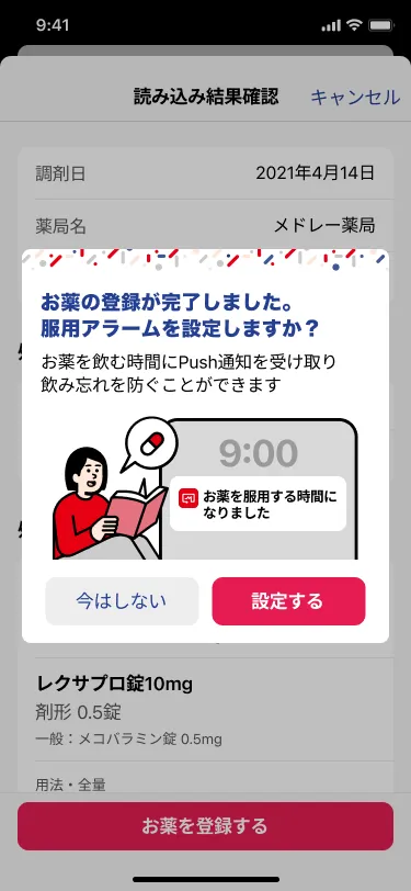 吉岡: ここまでで、下準備が整ったので「服用アラーム」自体を実際にさらにユーザーに使ってもらうための施策として、登録までの導線を改善することにしました。今まではお薬を登録するか、お薬と服用アラームを同時に登録するか選べたのですが、お薬手帳への薬の登録後に「服用アラーム」の設定を促す導線を表示するように改善しました。理由としては、薬の登録をしてから「服用アラーム」の登録をしたユーザーの割合を調べてみたところ、大多数のユーザーが設定をしていなかったことが分かったからです。